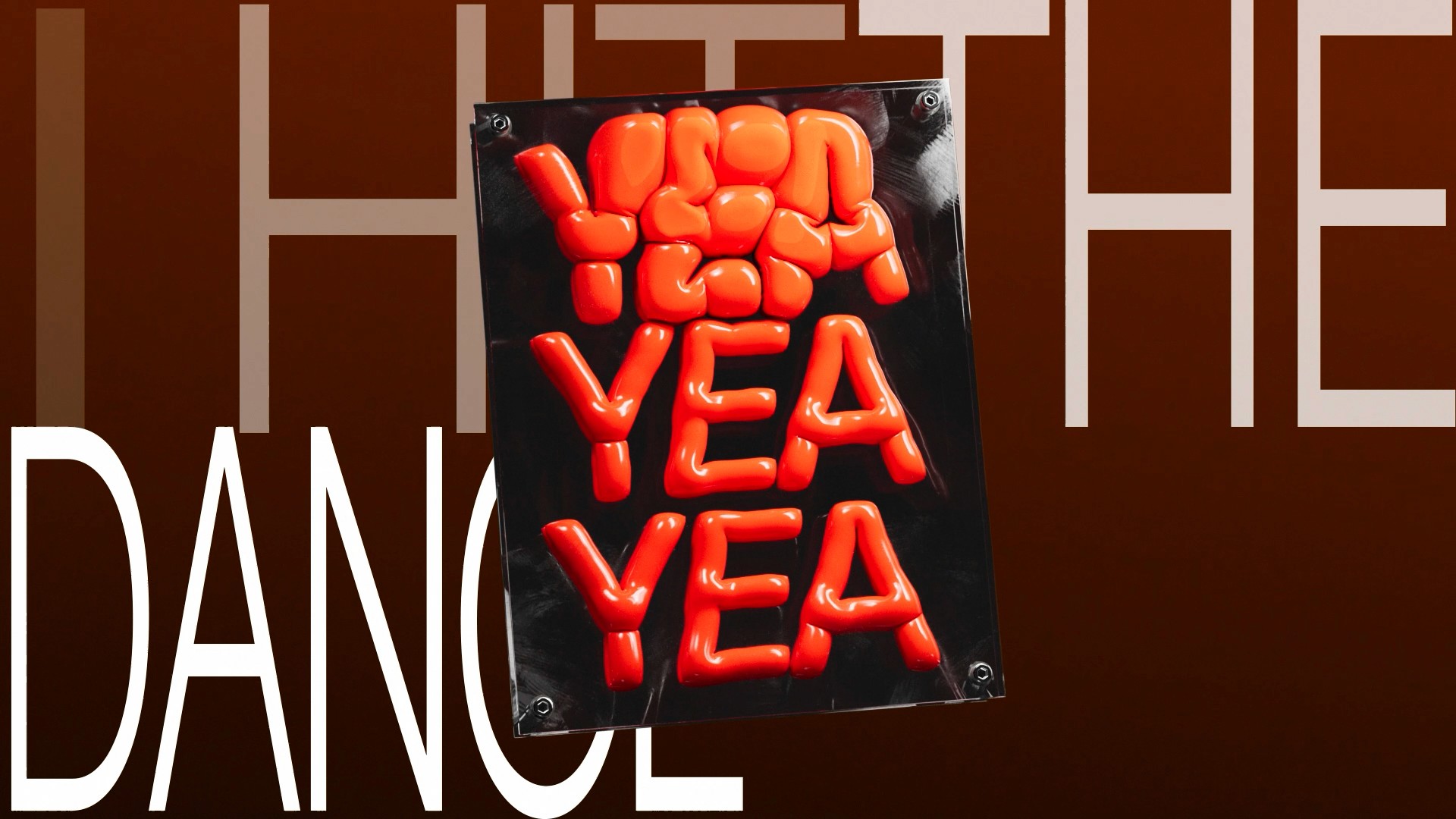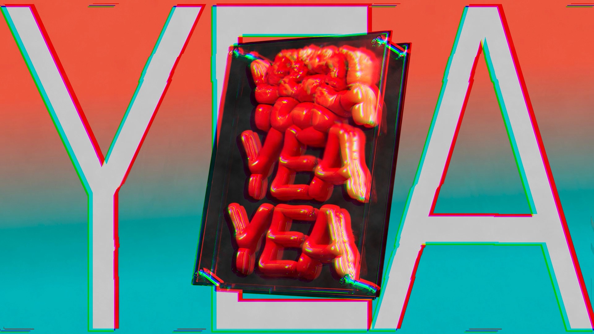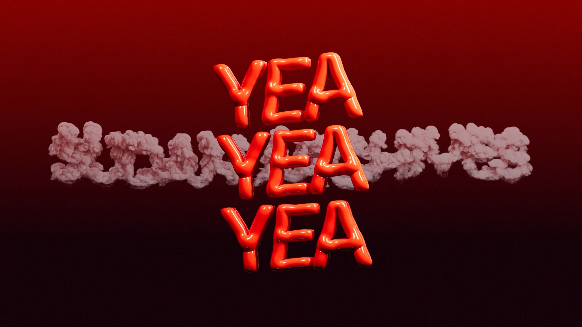 The base shapes for the anchoring 3D YEA YEA YEA were built using a cloth simulation. To time the inflation precisely, I then used the different states (semi-inflated, full inflation) as morph poses, triggered by animated fields.